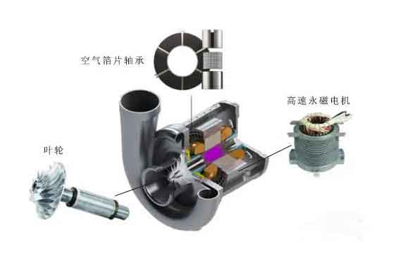 一、什么是空氣懸浮鼓風機? 空氣懸浮鼓風機是空氣在鼓風機轉子高速旋轉下,會在轉子與箔片軸承表面之間產生動壓效應,形成一個高壓氣膜而將轉子托浮起來的一種鼓風機! 空氣懸浮鼓風機起源于韓國,是從飛機渦輪發動機的技術上分離出來的產品,其研發人員多為設于韓國的“三星(國家)空氣動力技術研究所”(原來擔負著軍工航空航天技術研發的單位)。在東西方冷戰時期,韓國作為位于亞洲屬于美國為首的西方陣營里的一員,在技術及貿易上給予了韓國極大的支持,并將一些軍事方面的項目放在韓國國內研發,以扶持韓國的軍工科研技術水平,其中的研發單位就包括這個負責航空航天方面的空氣動力技術研究的三星研究所。后來由于前蘇聯解體,東西方冷戰結束,韓國的一些軍工科研項目也隨著下馬,一些掌握著專利技術的科學家離開研究所后設立自己的生產企業,將原來的軍工技術民用化開發出先進的產品并商用。空氣懸浮離心鼓風機就是這樣一個產品。 二、空氣懸浮鼓風機原理及組成 1、空氣懸浮鼓風機的組成與原理 空氣懸浮鼓風機主要包括葉輪、空氣懸浮軸承、變頻器、高速永磁電機及其結構控制系統。電機主軸與風機葉輪同軸,高速轉子系統由空氣懸浮軸承直接支撐。其主要核心技術是空氣懸浮軸承技術、高速永磁同步電動機及其控制技術。空氣懸架軸承以空氣為工作介質,以彈性平坦箔片為支撐面,以彈性波浪箔片為支撐構件。