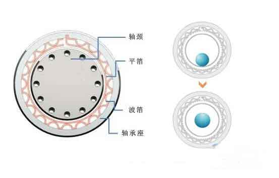 最初,葉輪轉子與軸承接觸,但當轉子進入高速旋轉狀態時,由于空氣的粘性和楔塊的作用,平面間會產生動壓效應。在箔片和轉子表面,使扁平箔和波紋箔發生彈性變形,將扁平箔推開,然后使轉子處于懸浮狀態。 不均勻的圓周氣壓使箔片軸承具有承受載荷的能力。或者更簡單地說,在轉子高速旋轉期間,在轉子和箔片之間形成高壓氣膜,從而提升轉子。