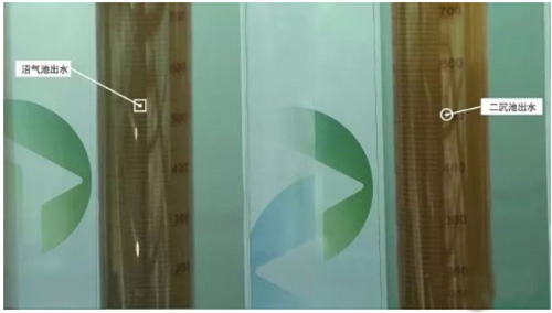 污水處理流程 具體流程: 01、養殖場排出的廢水在收集池沉淀后,經由污水提升泵送達至固液分離機,進行干濕分離,得到濾液; 02、濾液通過壓力泵抽送到厭氧反應器進行厭氧發酵,利用產生的沼氣進行發電獲得再生能源。 03、通過厭氧發酵的沼氣池出水便經由氨氧化池,缺氧池到達好氧池。在處理過程中,技術部門改進工藝,將連續曝氣改為間歇曝氣,曝氣時間減少三分之一,在節約時間的同時也節約成本。 04、二沉池出水后便要經過二級膜分離濃縮。通過后端增加的MBR膜反滲透膜來實現,MBR膜具有高效的截留率,能夠將原水中的大部分物質截留,進而實現對廢水的凈化→分離→提純。此外MBR將傳統污水處理的曝氣池,與沉淀池合二為一,大幅度的減少了占地面積。污水經過二級膜分離濃縮處理之后,基本上已經很清澈了。 沼氣池與二沉池水顏色對比