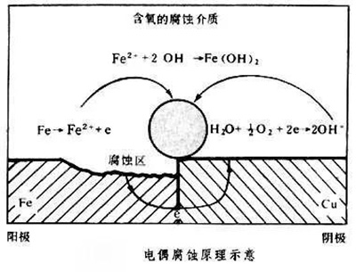 電偶腐蝕 電偶腐蝕:很多生產裝置是用不同的金屬或合金制造而成,這些材料是互相接觸的。由于不同金屬電位間存在著差異,在水溶液(電介質)中形成電偶電池,較活潑的電位較負的金屬是陽極,腐蝕速度要比未偶合時高;電位較正的金屬是陰極受到保護,腐蝕速度下降或停止。在系統中,常見的電偶腐蝕有鐵和黃銅、鐵和不銹鋼、鋁和鋼、鎊和鋼、以及鋅和黃銅等,不論在哪種情況下,都是前一種金屬遭受腐蝕。 看點04:氧濃差腐蝕