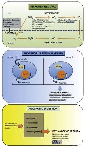 在人類漫長(zhǎng)的歷史長(zhǎng)河中,水可利用性發(fā)揮著至關(guān)重要的作用。隨著人口增長(zhǎng)和經(jīng)濟(jì)社會(huì)活動(dòng)的增加,全球需水量也在持續(xù)上升,而隨之帶來(lái)的水污染也越加嚴(yán)重。這在很大程度上促進(jìn)了污水處理工藝的發(fā)展,其中生物污水處理系統(tǒng),利用微生物特性降解有機(jī)質(zhì)、去除營(yíng)養(yǎng)物質(zhì),把有毒物質(zhì)轉(zhuǎn)化為無(wú)毒物質(zhì),在污水處理中扮演著重要角色。 然微生物在污水處理過(guò)程中如此重要,那微生物在污水處理過(guò)程中到底是如何發(fā)揮作用的既呢?污水處理過(guò)程中的微生物又該如何研究呢? 污水處理中微生物的研究方法 分子生物學(xué)方法如PCR技術(shù)的革新,徹底改變了污水處理過(guò)程中微生物研究的現(xiàn)狀。“組學(xué)時(shí)代”到來(lái),對(duì)污水處理系統(tǒng)中微生物系統(tǒng)發(fā)育和功能多樣性的研究帶來(lái)了轉(zhuǎn)折(圖1)。高通量測(cè)序技術(shù)的發(fā)展,極大地降低了測(cè)序成本。除了分離微生物的全基因組測(cè)序研究,宏基因組學(xué)和宏轉(zhuǎn)錄組學(xué)方法也已經(jīng)被應(yīng)用于揭示污水處理系統(tǒng)整體微生物群落基因組潛能和轉(zhuǎn)錄本信息。 除基于核酸的方法外,宏蛋白組學(xué)和宏代謝組學(xué)方法(圖1)的出現(xiàn),推動(dòng)了污水處理過(guò)程中微生物與微生物、微生物與生物大分子互作的研究。 污水處理系統(tǒng)微生物多樣性 利用高通量測(cè)序技術(shù)揭示對(duì)污水處理廠活性污泥的研究揭示,其優(yōu)勢(shì)菌門為變形菌門,而在不同條件也會(huì)有不同比例的其它類群(如擬桿菌門,綠彎菌門,放線菌門,浮霉菌門,厚壁菌門等),并且很多類群是之前分子生物學(xué)方法無(wú)法檢測(cè)到的。另外,宏基因組學(xué)研究闡明,污水處理系統(tǒng)中微生物群落的主要的功能分類有:碳水化合物活性酶,蛋白質(zhì)代謝和氨基酸衍生物或芳香族化合物的代謝等。