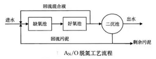 AN/O (Anoxic/Oxic) 工藝是一種有回流的前置反硝化生物脫氮流程,其中前置反硝化在缺氧池中進行,硝化在好氧池中進行。 AN/O (Anoxic/Oxic) 工藝流程圖: