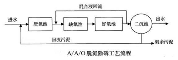 在AN/O工藝流程中, 原污水先進入缺氧池,再進入好氧池,并將好氧池的混合液與沉淀池的污泥同時回流到缺氧池。污泥和好氧池混合液的回流保證了缺氧池和好氧池中有足夠數量的微生物,并使缺氧池得到好氧池中硝化產生的硝酸鹽。 而原污水和混合液的直接進入,又為缺氧池反硝化提供了充足的碳源有機物,使反硝化反應能在缺氧池中得以進行。反硝化反應后的出水又可在好氧池中進行BOD的進一步降解和硝化作用。 為了達到同時脫氨除磷的目的,在Ap/O工藝中增設缺氧區,構造了厭氧/缺氧/好氧(A/A/O) 工藝。 (A/A/O)脫氮除磷工藝流程: