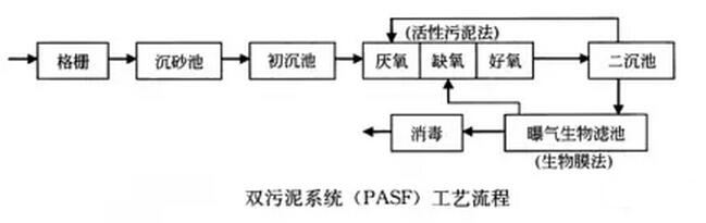 為了克服以上矛盾,近年來出現了采用活性污泥法和生物膜法相結合的污水處理工藝。其中,由上海市政工程設計研究總院(集團) 有限公司開發的雙污泥脫氮除磷處理工L藝(PASF) 是一種典型的活性污泥法和生物膜法相結合的工藝。