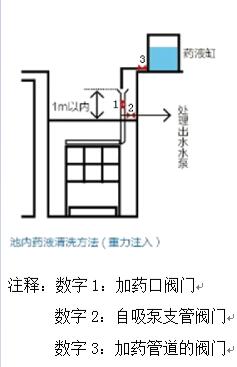 二、加藥過程: 將配置好的溶液送入膜內,單組膜組件加滿藥劑的時間控制在 10-15 分鐘左右。 若加藥過程中,加藥敞口處有藥劑溢出,則立即停止加藥。待藥劑流入組件內,繼續加藥,直至藥劑加不進去為止。 三、加藥完成: 膜組件需要在藥劑內浸泡 3 個小時左右。自吸泵和風機仍然保持關閉狀態。 打開曝氣 5 小時,自吸泵不出水,培養污泥層。 浸泡完成后,關閉上圖中閥門 1 和閥門 3,打開閥門 2。 清洗完畢第一次出水時,將自吸泵出水閥門調小到設計流量的 1/3 處,運行一段時間后慢慢開大至設計流量。 注:以上為用次氯酸鈉藥劑進行單組膜組件的清洗步驟,其余膜組件均按照此清洗步驟進行操作。若用次氯酸鈉藥劑清洗效果不明顯,則需要用草酸或者檸檬酸或者鹽酸進行清洗,操作步驟同上。