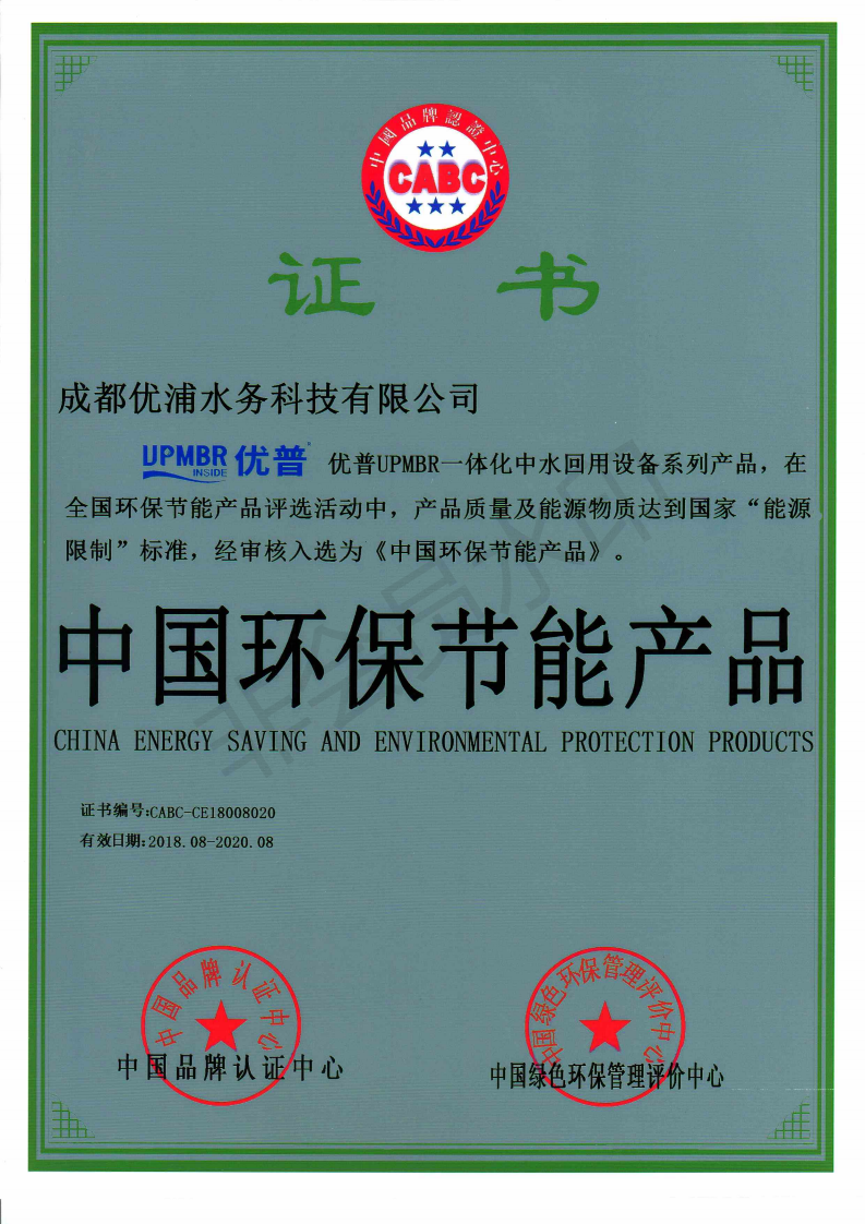2018年8月,成都優(yōu)浦水務(wù)科技有限公司成功獲得中國(guó)綠色環(huán)保管理評(píng)價(jià)中心與中國(guó)品牌認(rèn)證中心聯(lián)合頒發(fā)的“中國(guó)環(huán)保節(jié)能產(chǎn)品證書”。 優(yōu)普UPMBR一體化中水回用設(shè)備系列產(chǎn)品,在全國(guó)環(huán)保節(jié)能產(chǎn)品評(píng)選活動(dòng)中,經(jīng)專家評(píng)定,符合綠色、節(jié)能的要求、產(chǎn)品質(zhì)量及能源物質(zhì)達(dá)到國(guó)家“能源限制”標(biāo)準(zhǔn),現(xiàn)已獲得綠色建筑節(jié)能推薦產(chǎn)品證書。 中國(guó)環(huán)保節(jié)能產(chǎn)品證書的獲得,意味著優(yōu)普的技術(shù)研發(fā)能力已經(jīng)邁向更高臺(tái)階。優(yōu)普服務(wù)于國(guó)家戰(zhàn)略,以節(jié)約資源、保護(hù)環(huán)境、建設(shè)綠水青山為基本原則,為國(guó)內(nèi)的污水處理提供綜合解決方案,為客戶創(chuàng)造更多的價(jià)值。